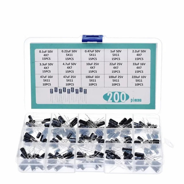 200pcs Electrolytic Capacitor Assortment Kit (0.1uF–220uF, 10V–50V)
